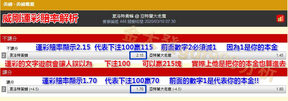 運彩賠率顯示會把你下注的本金包含進去,也就是說本金100,獲利115總共就是2.15…不要在傻傻的被套路都不知道….比起運彩獨贏賠率144整整相差了29塊台幣,下注1000就少拿了290台幣,還在玩運彩的你有沒有頭很暈?
