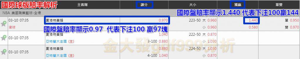 首先下圖可以先看到國際盤顯示賠率方式淺顯易懂,讓分0.97就是下注100可贏97塊台幣,包含本金總共可拿回197元!