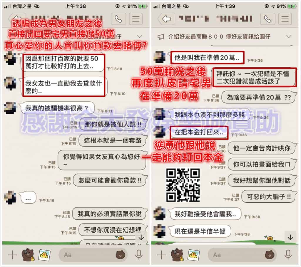 詐騙集團成員埋伏在網戀平台裡,無所不在!尋找孤單寂寞或者好色的單身男性下手。起出曖昧不間斷,關心問候更是基本話術,此時你已被她溫暖柔情的攻勢迷的神昏顛倒,之後問你要不要出來見面!爭取你百分之兩百的信任,見面之後就開始純純的愛,讓你覺得她好清純可人,真的是喜歡的不得了!在純情的攻勢之下~就會開始話術你,跟你說她家人生病需要醫藥費或者急需用錢可以先借錢應急嗎?在者直接跟你說要不要一起玩遊戲!一起贏錢!可愛女友都開口了肯定要好好的表現一下,此時你就是那個掉進詐騙愛情炫窩的大豬頭