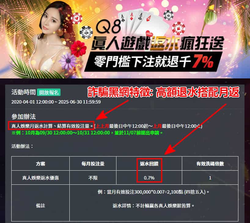 上圖有沒有發現亮點,回饋送7%異常高,玩家還需要主動申請才有贈點,沒申請只能自己勾咕賽..但..詐騙就是詐騙,就算有申請領不領還是一回事..Q8娛樂城評價本身就有不出金問題,連輸百萬會員想提領區區六萬水錢都領不到